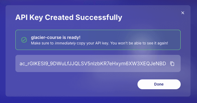 Once you've created and retrieved the key, you will be able to make authenticated queries by passing in your API key in the x-glacier-api-key header of your HTTP request.