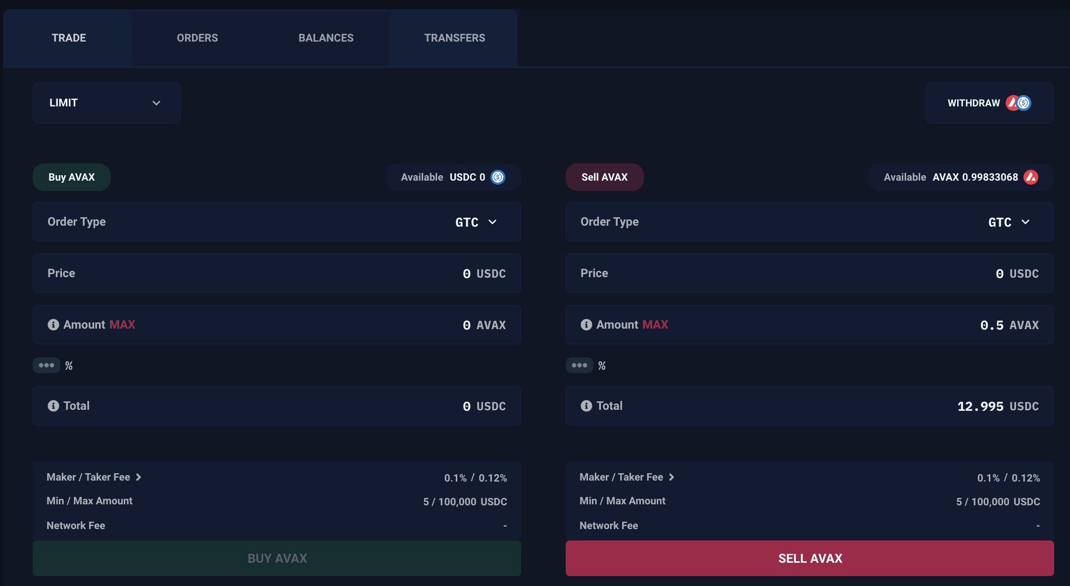 Now head to the Trade tab and sell 0.5 AVAX for USDC. You can select the trading pair AVAX/USDC on the top right. The website will prompt your wallet to switch networks to the Dexalot L1. Confirm the switch and then sign the transaction.